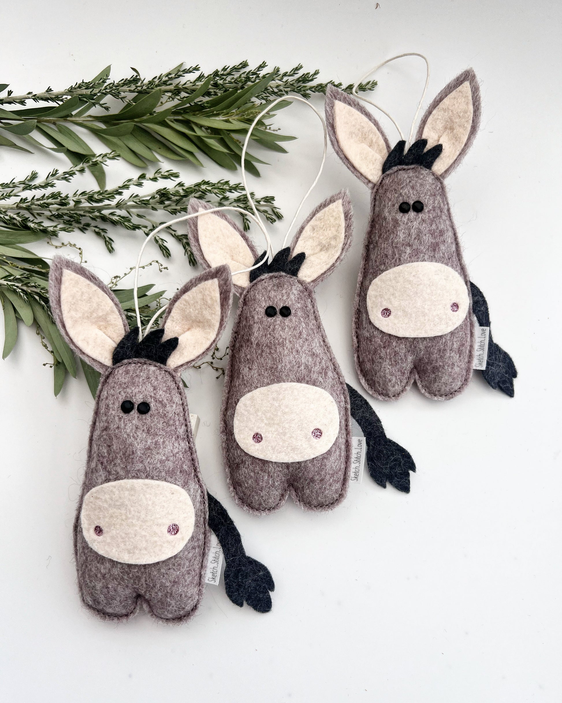 He’s a little shy but desperate to be loved. Each donkey is made from the softest wool blend felt and is hung from a loop of waxed cotton cord. They measure approximately 13cm in height.