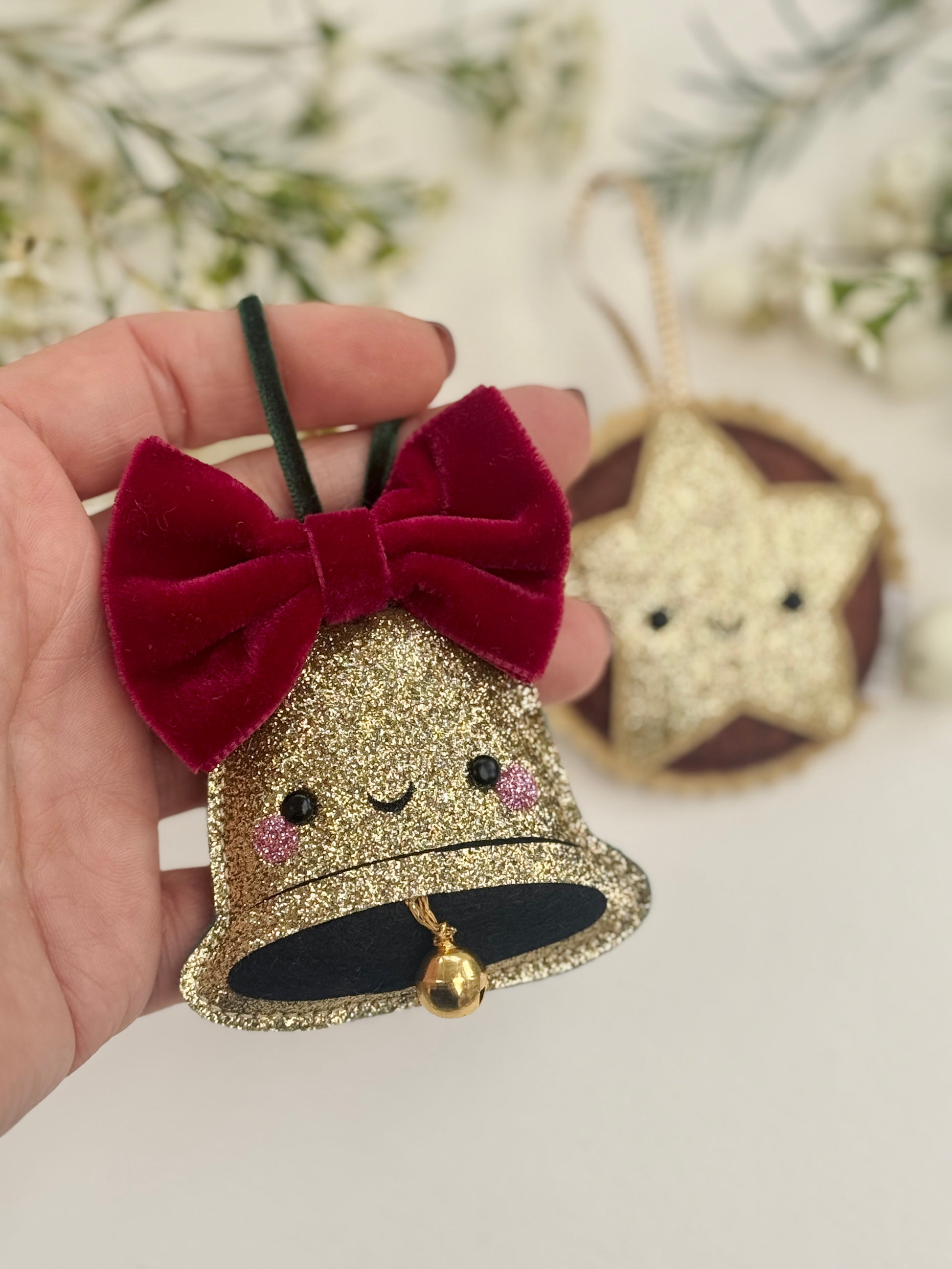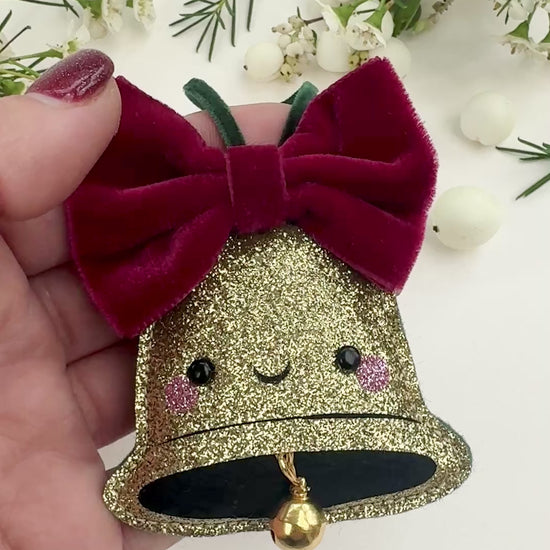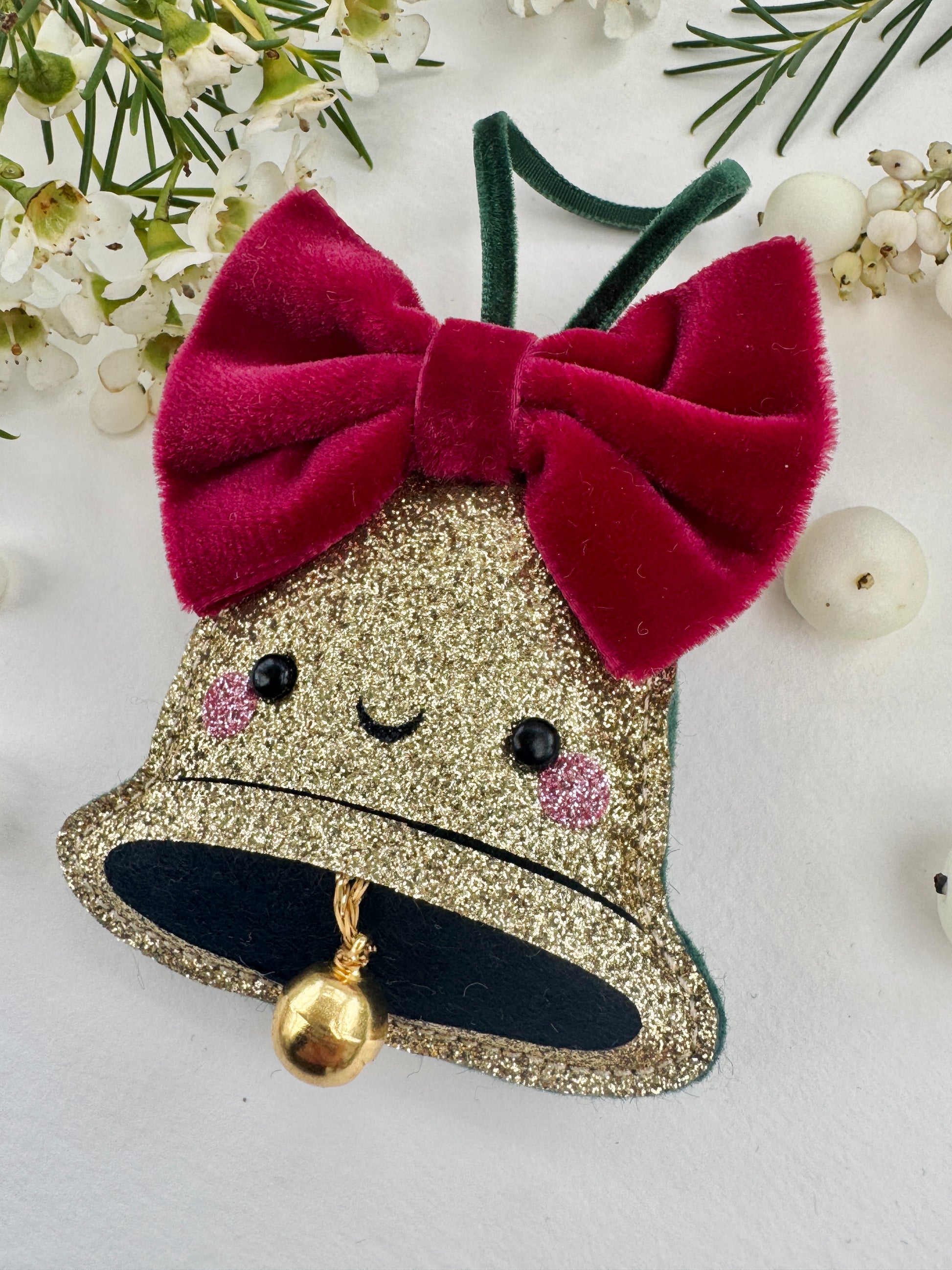 These bells are backed onto a dark green felt, have a dark green velvet hanging loop and even have a little jingle bell so you can hear them coming.