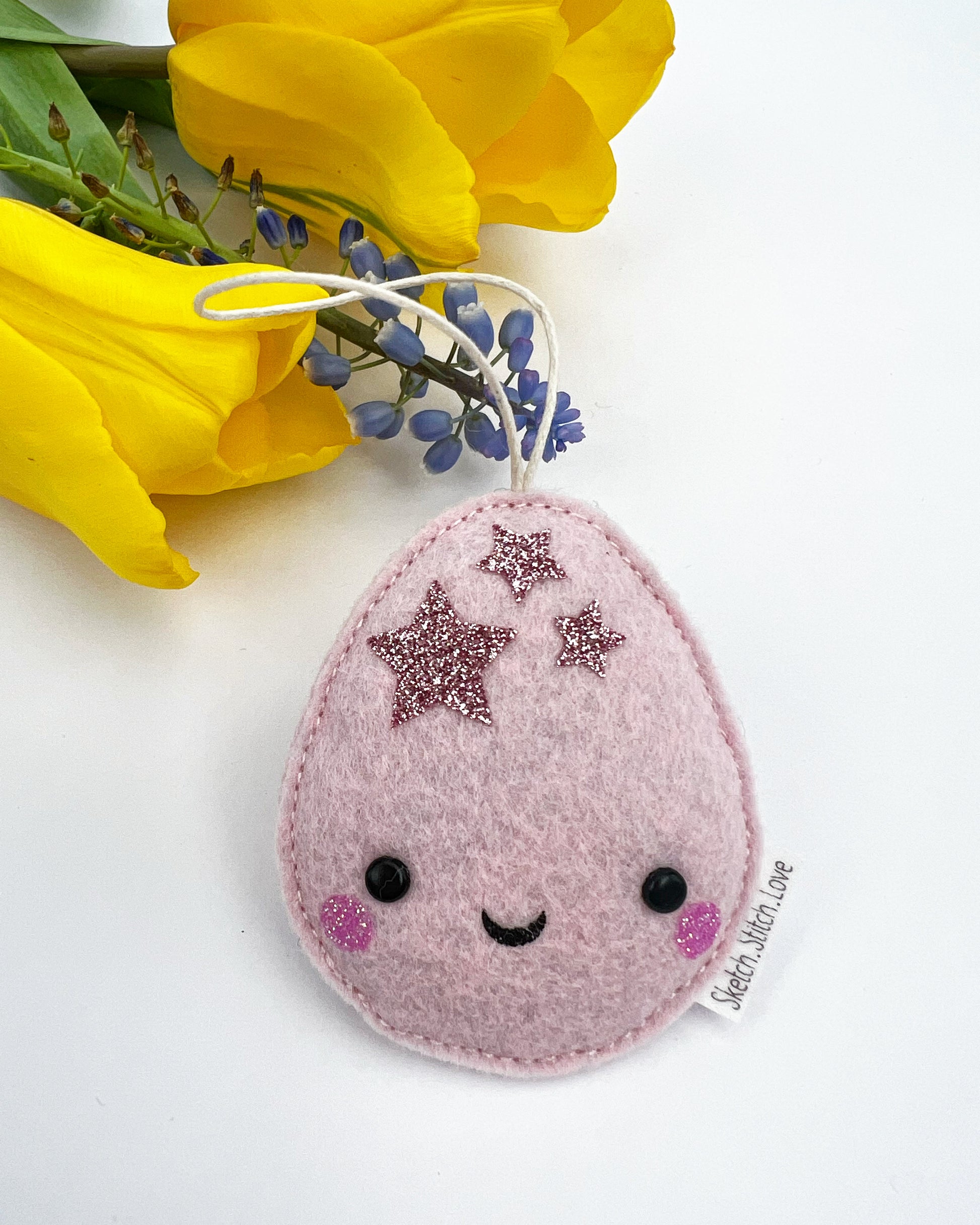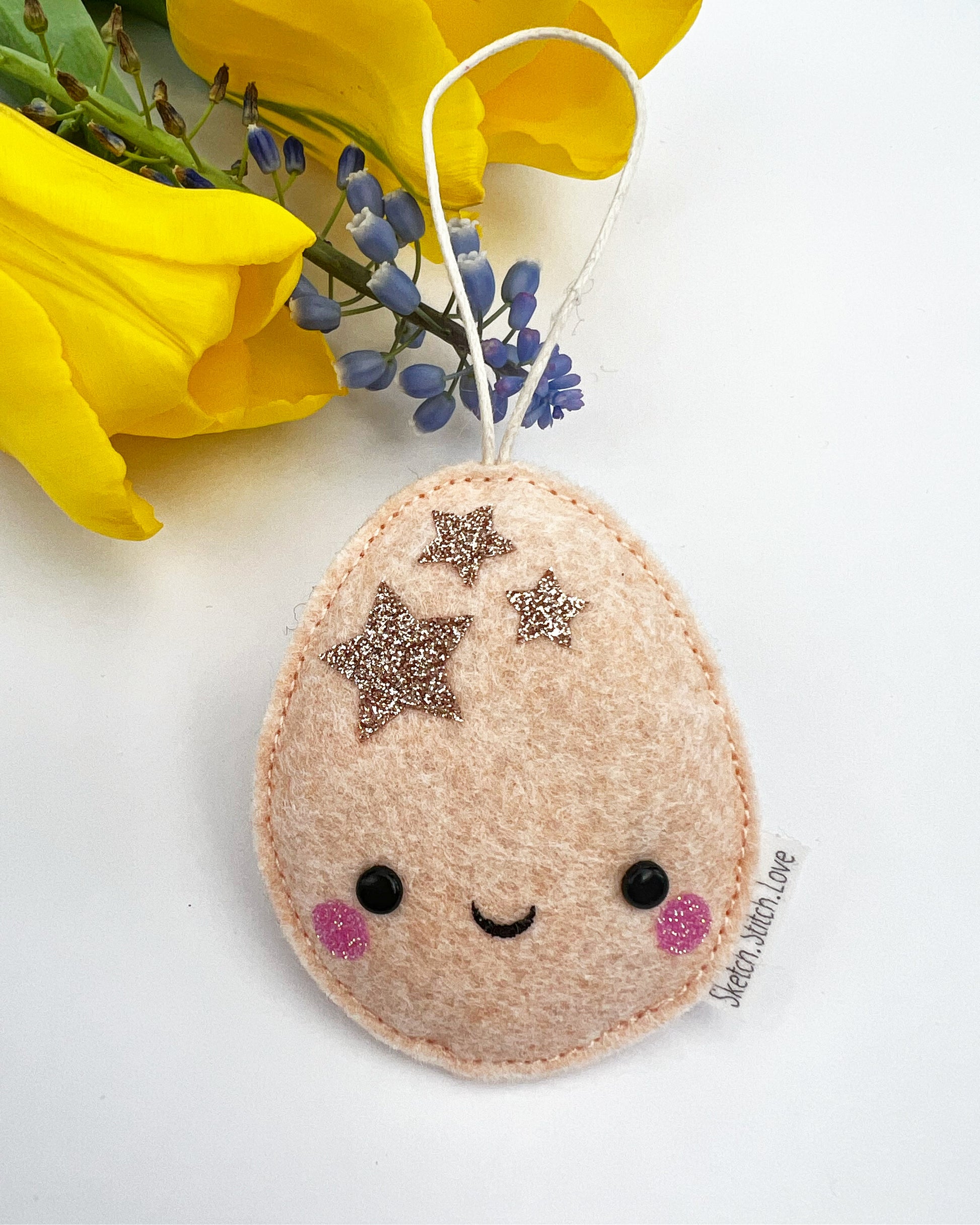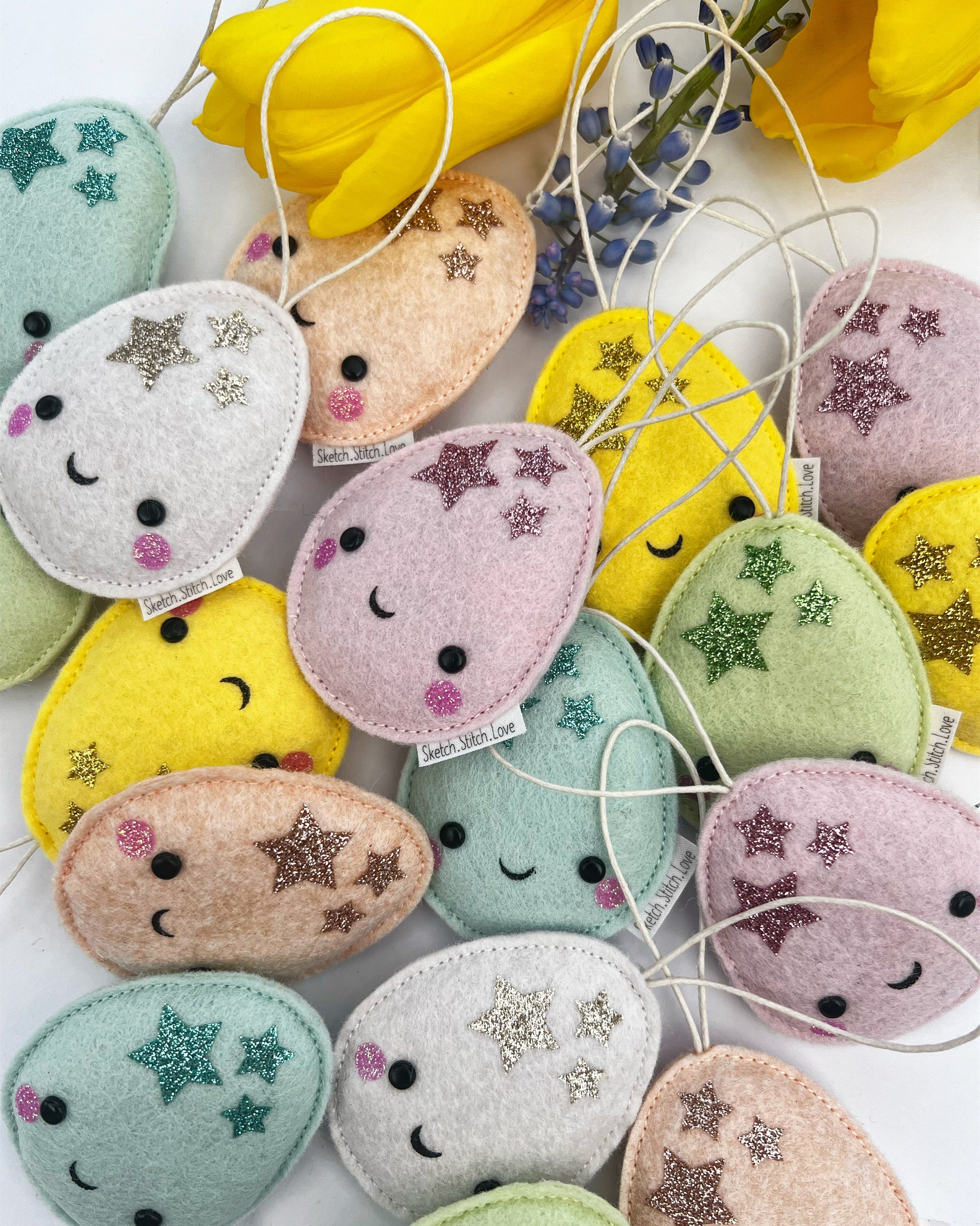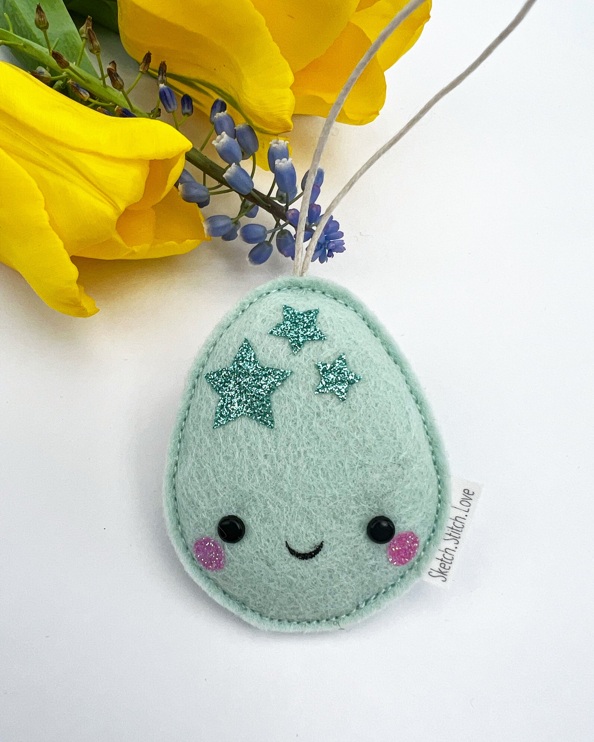 These little Mini Eggs will make a very sweet addition to your Easter tree. Their pastel shades are given a little pop of colour with the glitter stars. Made from the softest wool blend felt, they measure approximately 6cm in height.