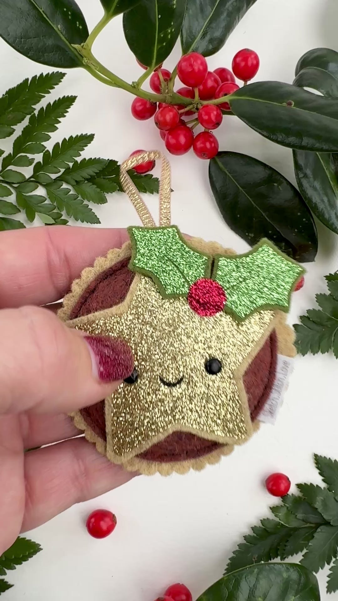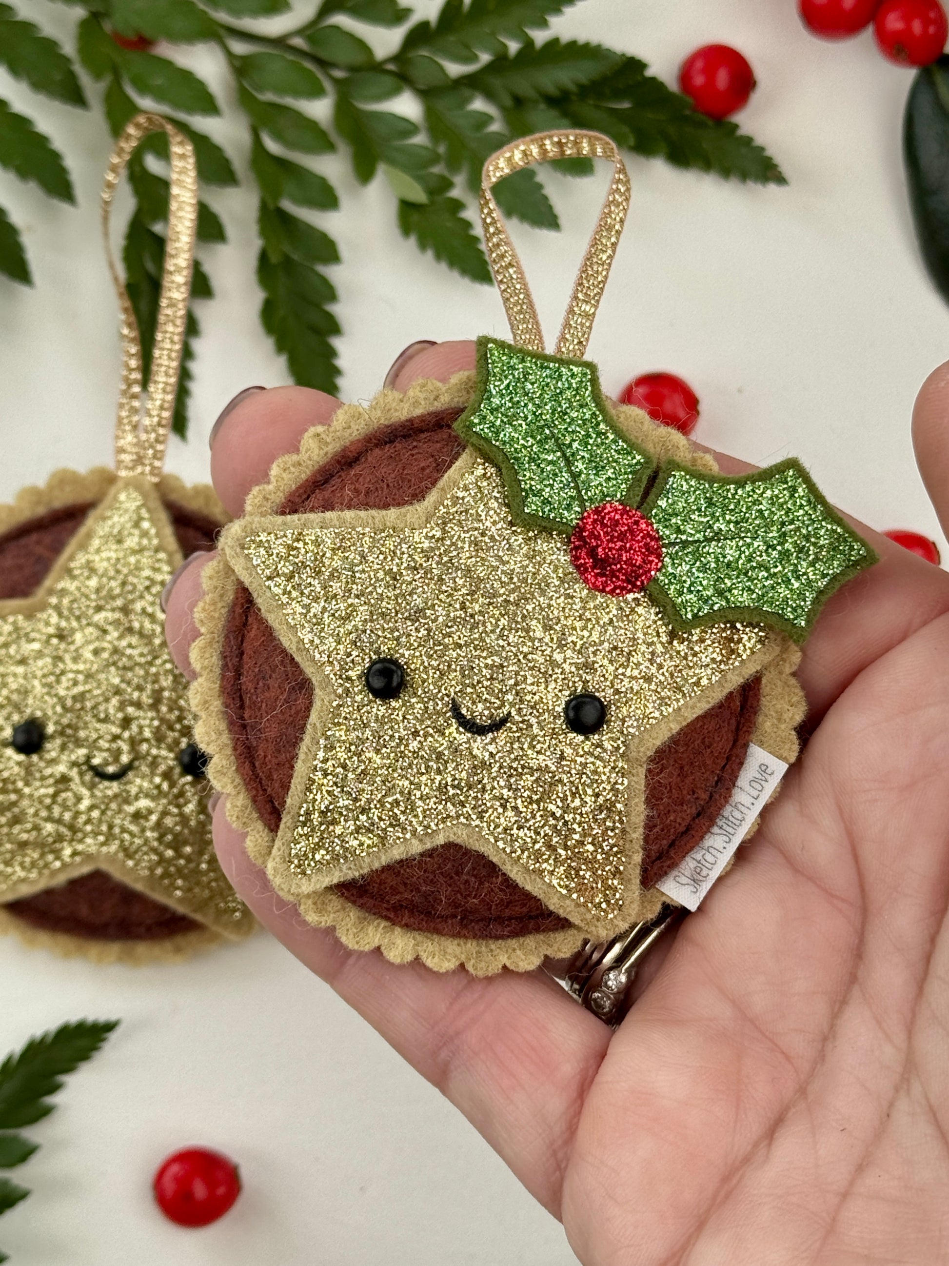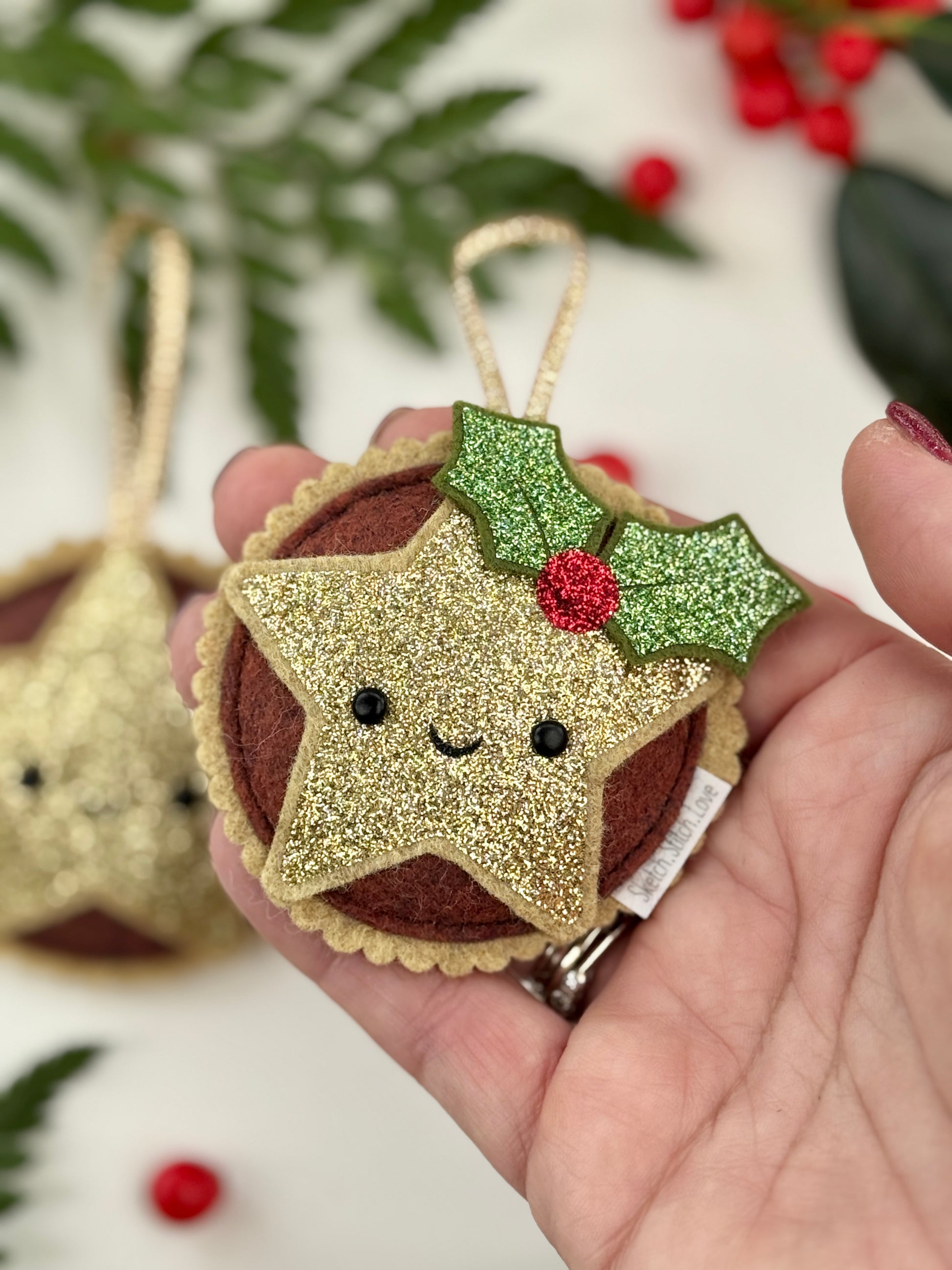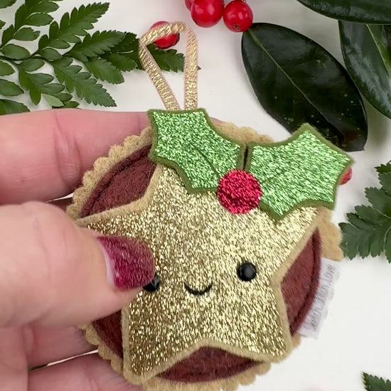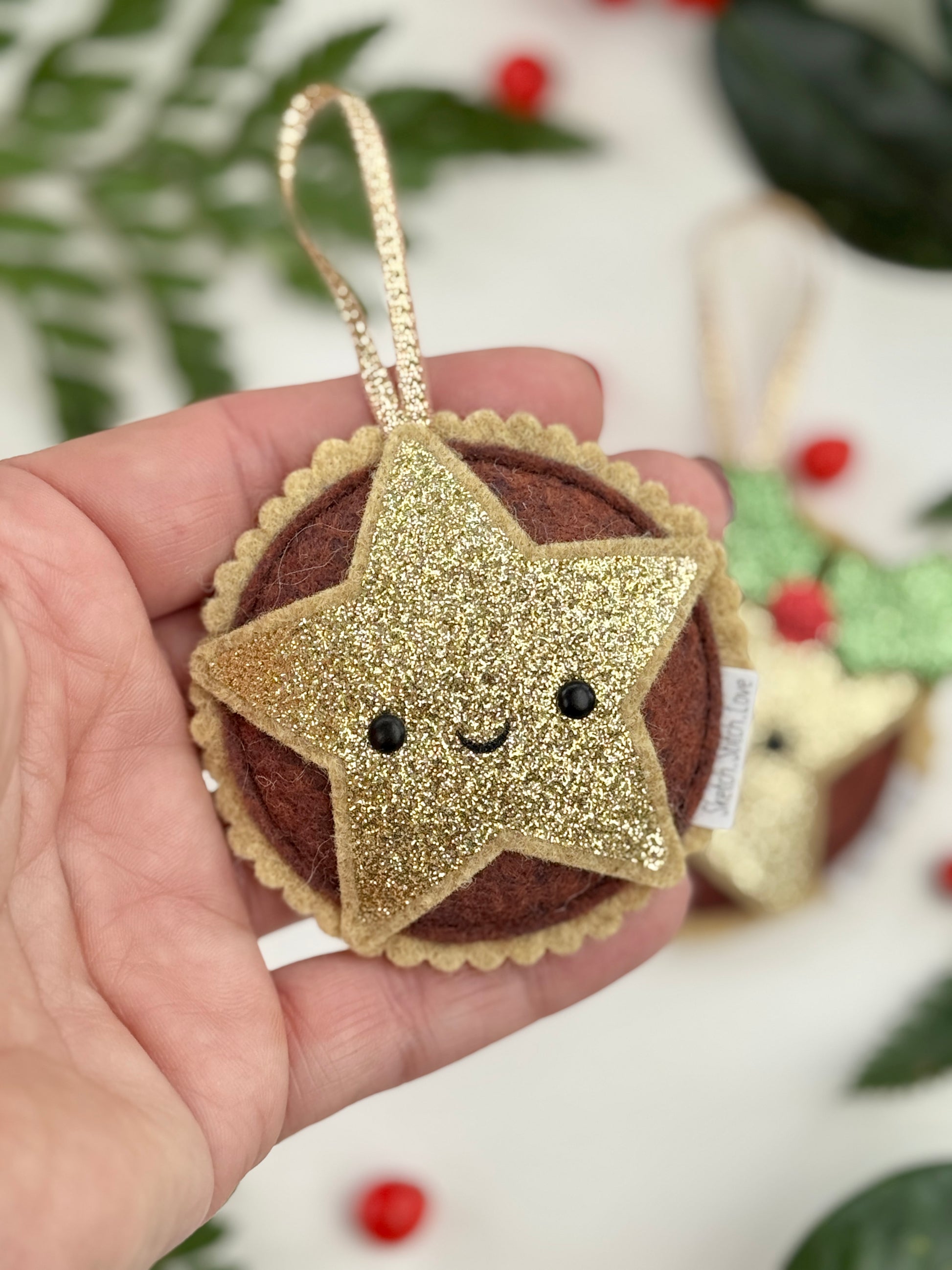 These cheeky Mince Pies have been lovingly handmade from the softest wool-blend felt. They have metal brad eyes and a little glitter smile. They come with an optional Sprig of Holly.