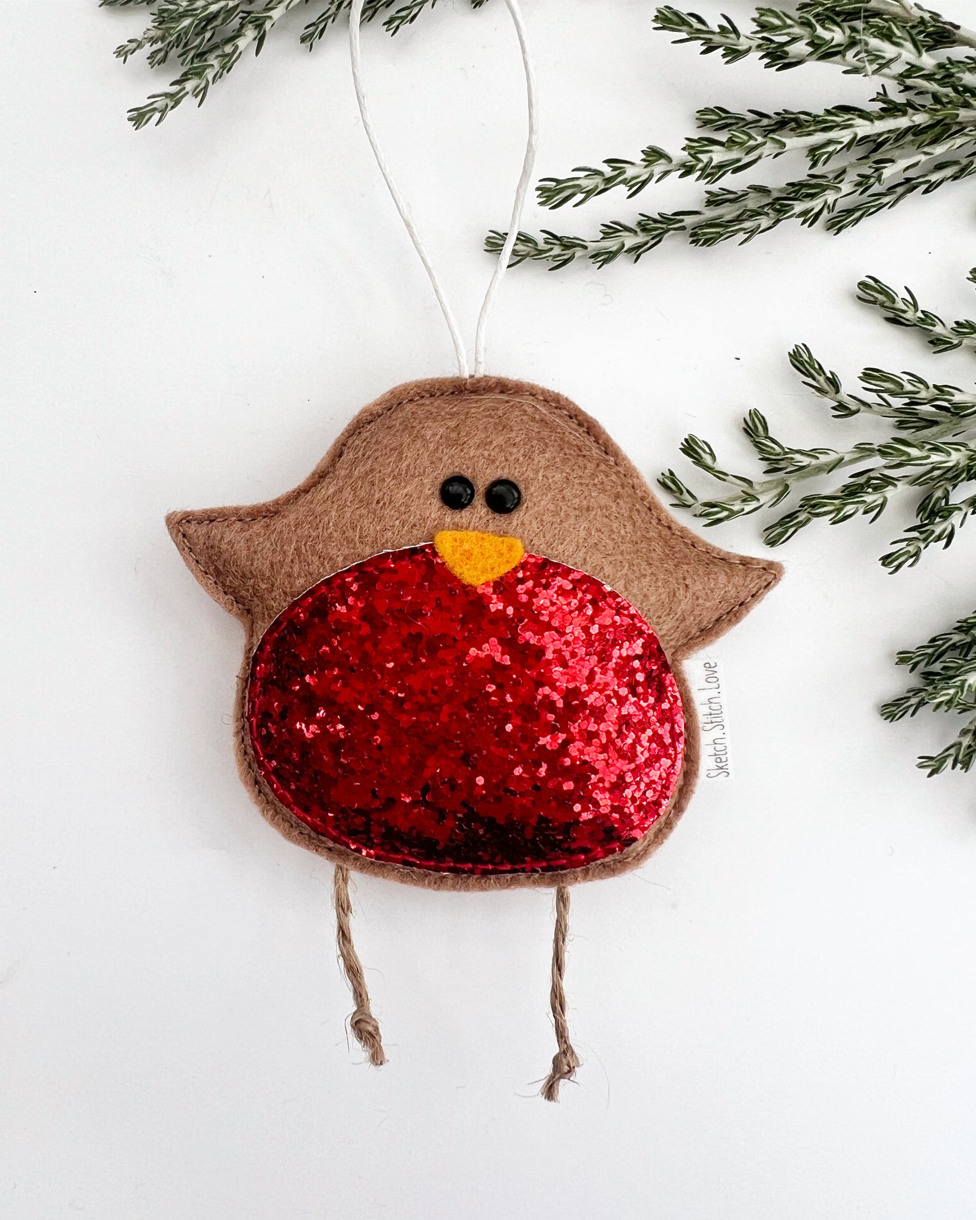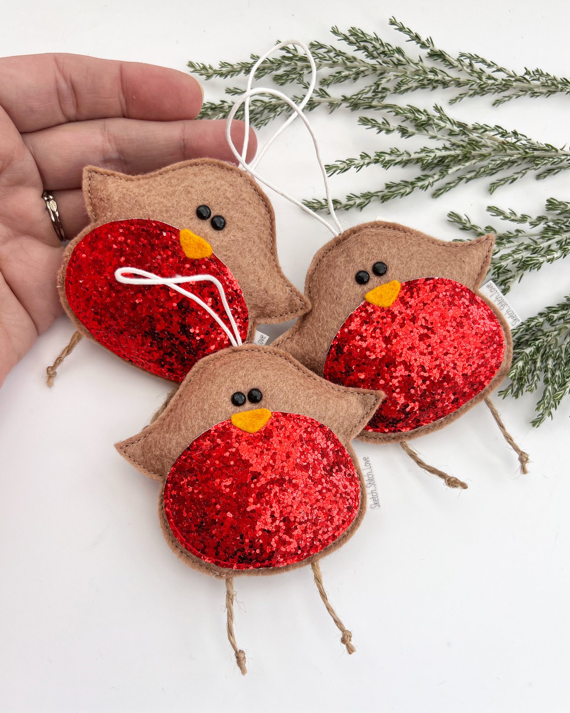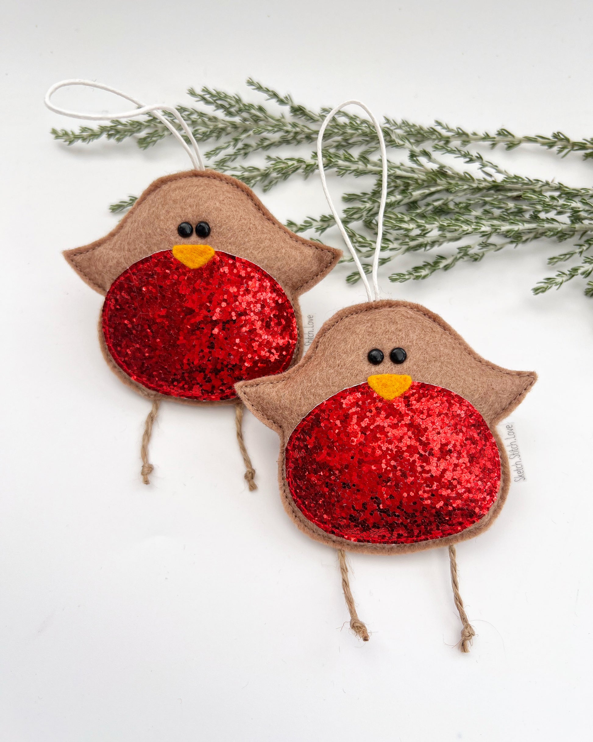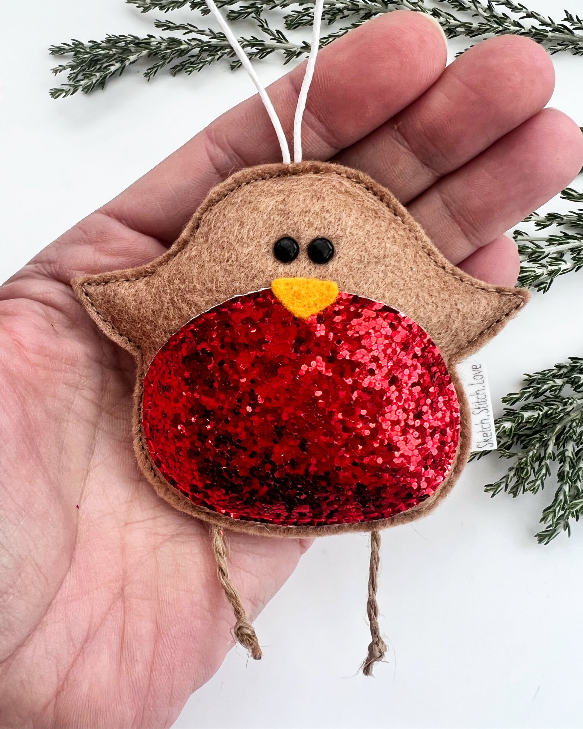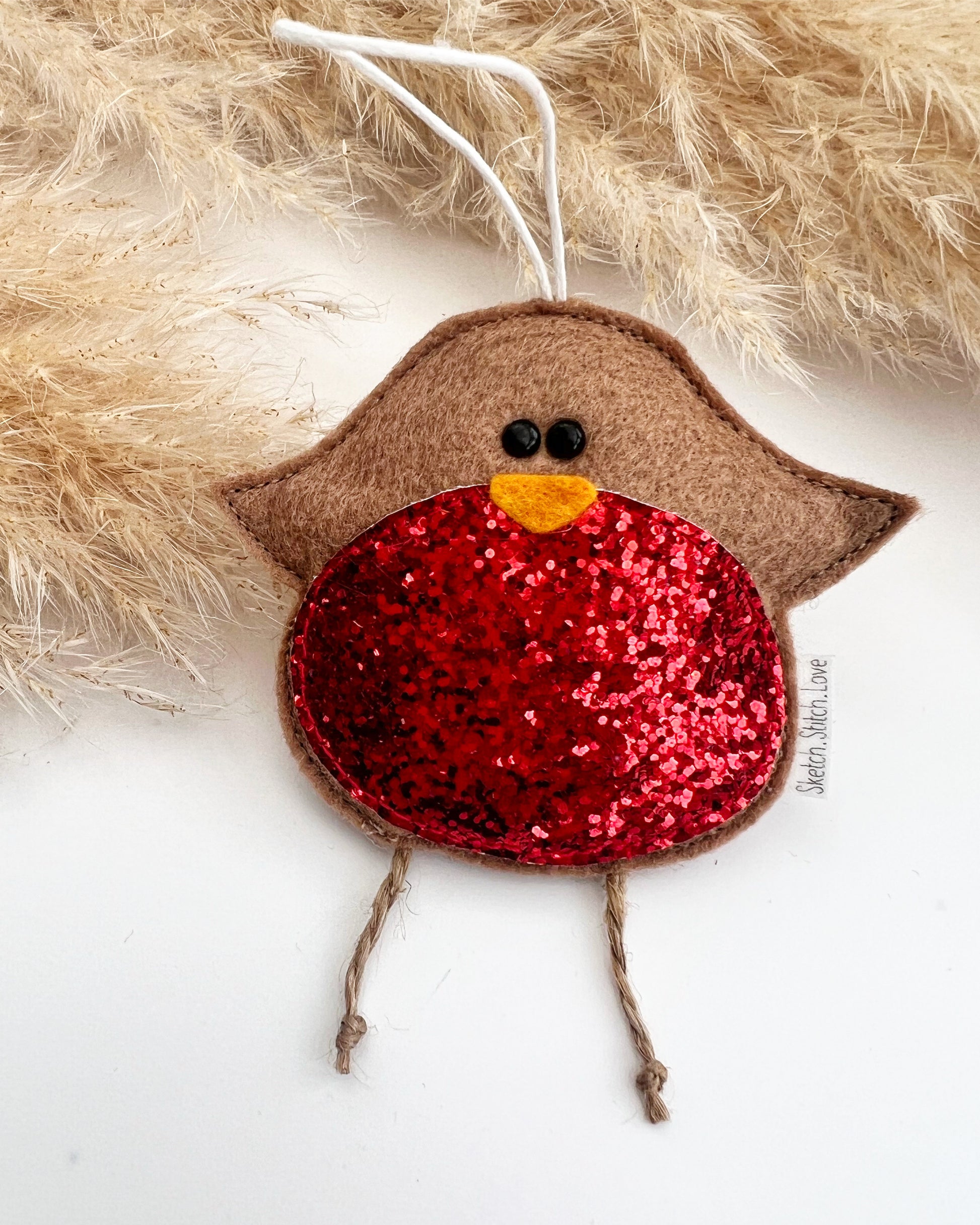 This plump little bird is made from soft wool blend felt and chunky glitter fabric. He measures approximately 9cm in length from head to the tip of the toes.