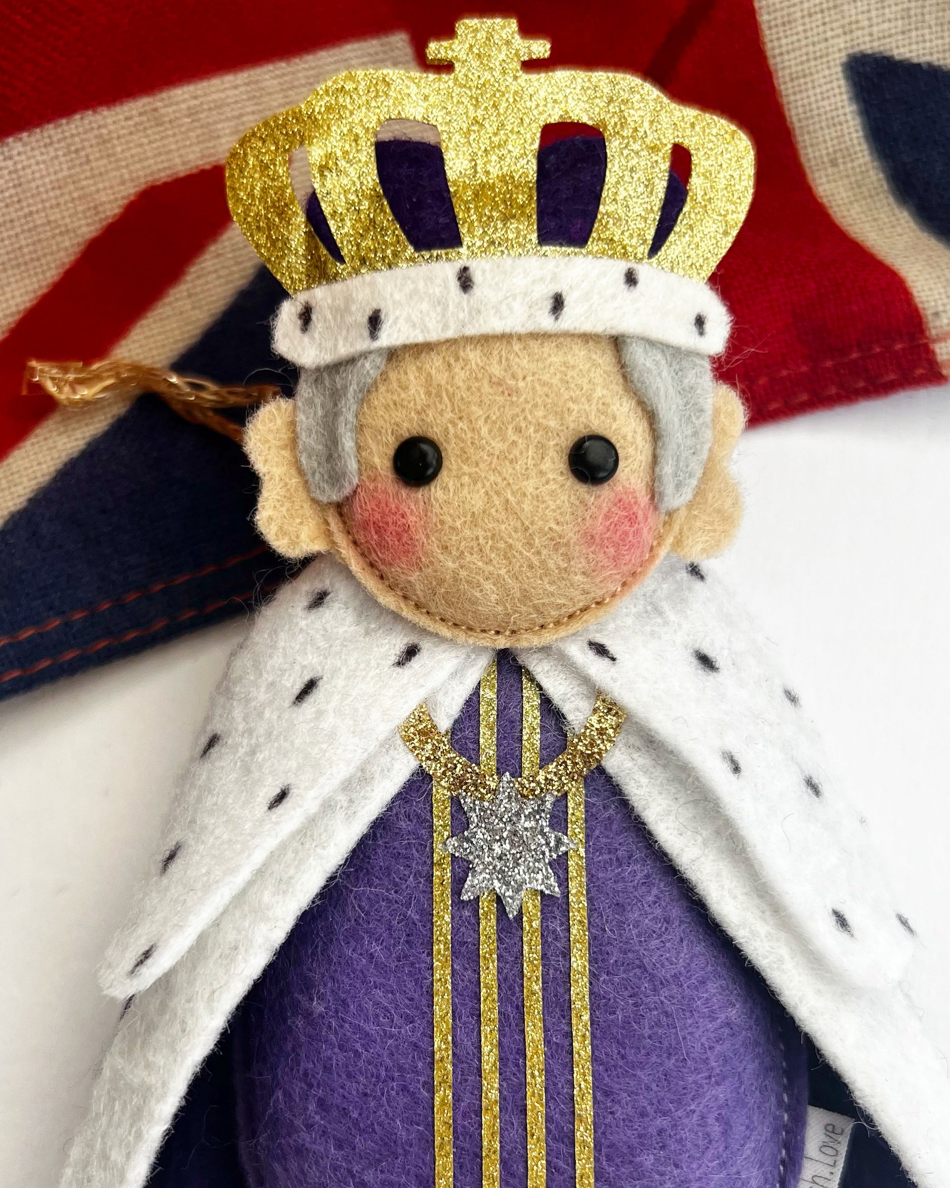 Here he is in all his purple splendour with his royal cypher on the back of his double layered cloak. A perfect Coronation keepsake or a very special decoration for your Christmas tree.